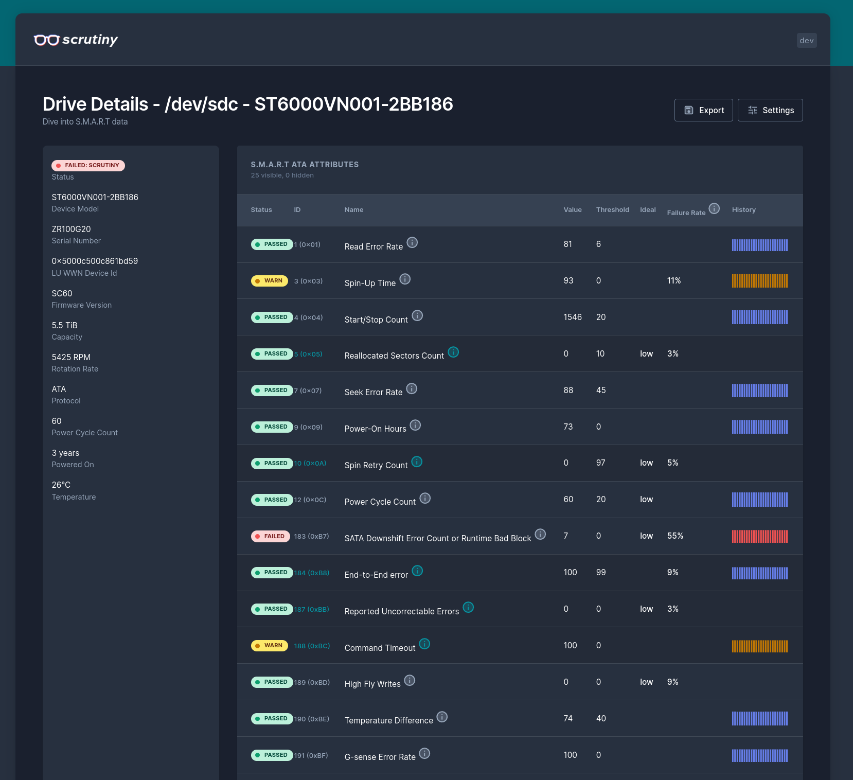 As good as smartd is, it has some shortcomings such as not recording historical data for each attribute, and relying upon value thresholds that are set by the manufacturers of the drive. Scrutiny aims to provide historical tracking of attribute readings, and thresholds based on real-world data from Backblaze.