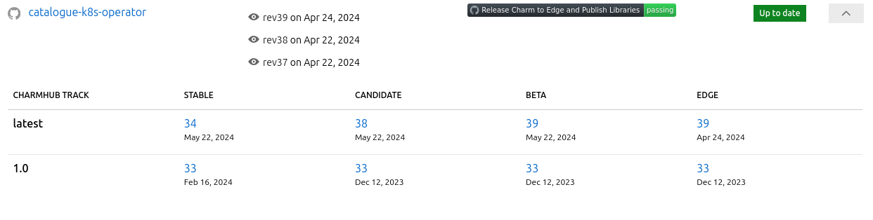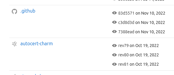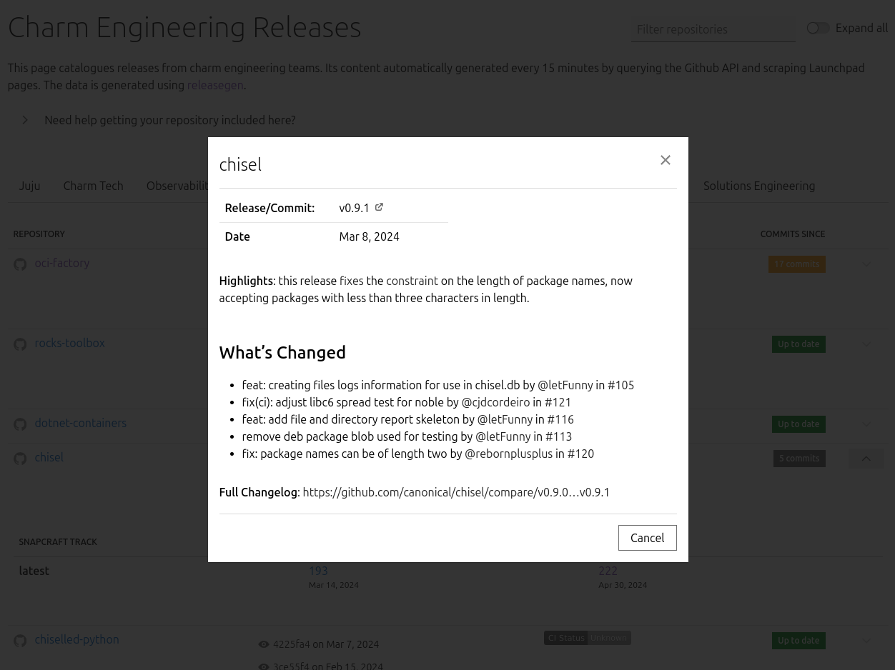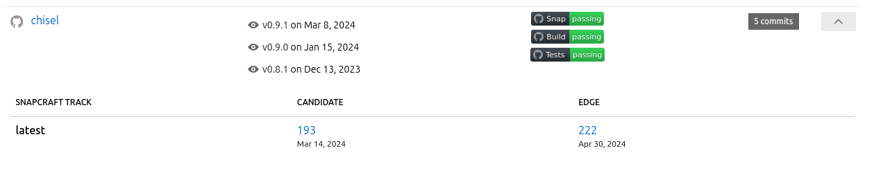 Aside from the big screenshot at the start of this post, I want to highlight a couple of details in the UI. Firstly, if there is an associated artifact for a given repository (a Snap or a Charm), the row can be expanded to show details of that artifact:
