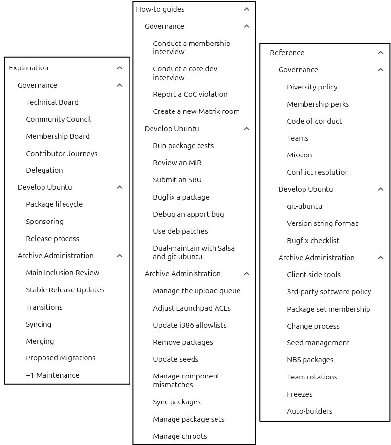 Most of those existing sites are specific - they document a particular product or ecosystem which neatly scopes the documentation structure, but the Diátaxis framework can also be used to bring structure, precision and clarity to the documentation of the Ubuntu project as a whole.