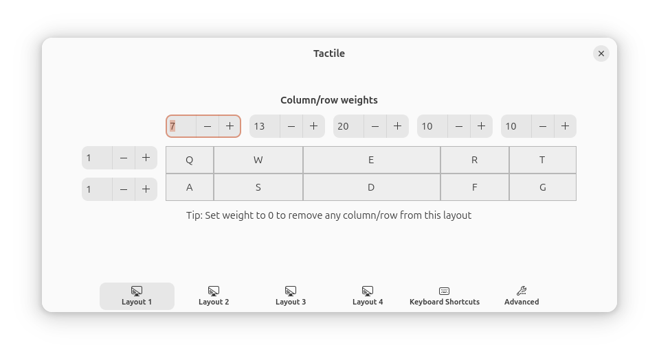 I took inspiration from Omakub, which is where I discovered Tactile - a GNOME extension for tiling windows to a custom on-screen grid using the keyboard. I’ve found this to be invaluable, and easily the best window management experience for GNOME. I’ve customised the grid to the following ratios (using gsettings in a script):